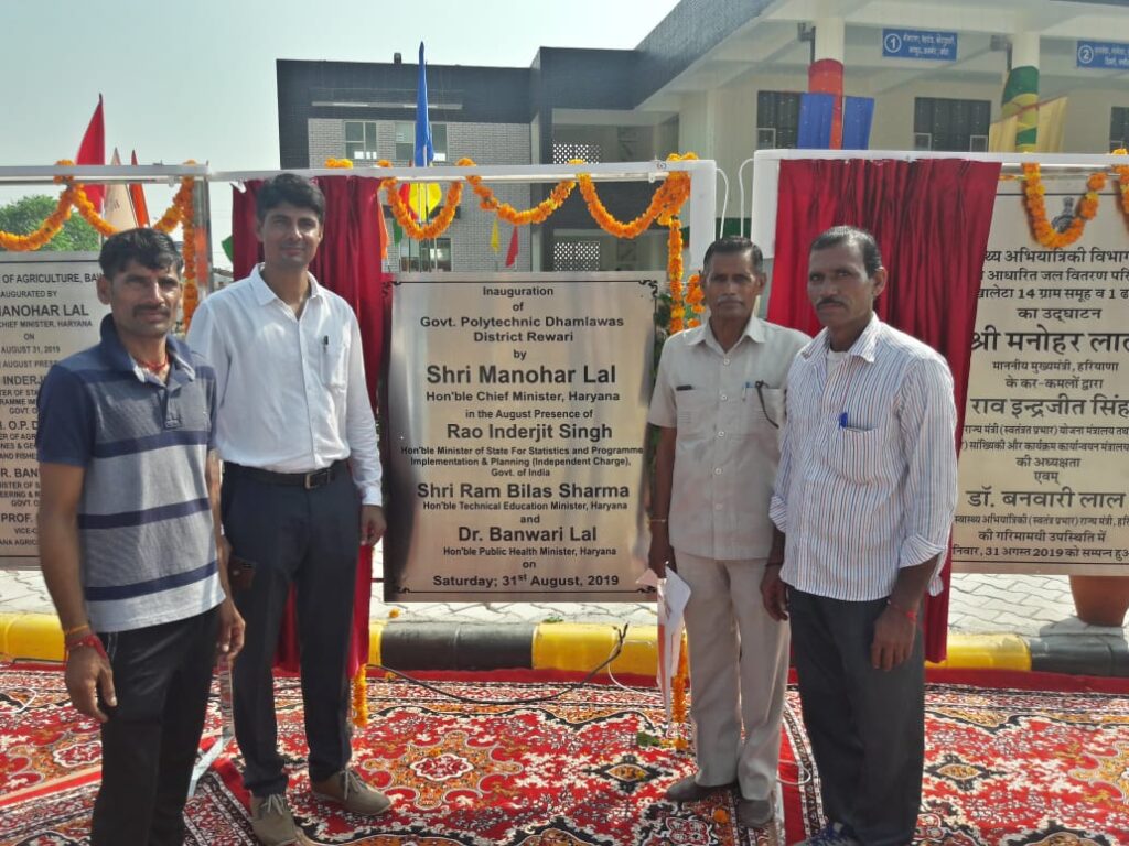 Last modified on April 15th, 2025 at 09:50 am WELCOME TO THE GOVT. POLYTECHNIC DHAMLAWAS (REWARI) Government Polytechnic Dhamlawas is located in Dhamlawas village of the district Rewari (Haryana). The Institute is situated on the Rewari-Narnaul Highway at a distance of 5 Km from Rewari. The institute is spread over 10.25 acres and is flourishing in a lush green and pollution-free environment away from the hustle and bustle of city life. This institute commenced in July 2018 with Guest classes at Govt. Polytechnic Lisana (Rewari) and with one branch, i.e., Diploma in Electrical Engg. The institute shifted in August 2019 to its campus at village Dhamlawas (Rewari); the new campus building was inaugurated on 31.08.2019 by Hon’ble Chief Minister Sh. Manohar Lal. The total area of the institutional campus is 10.25 acres, the institute has all the essential facilities for the students. Presently the following five courses(with the intake of 60 students in each course) are being run at this institute: Approvals & Affiliations The institute is a Government institute approved by the All India Council of Technical Education(AICTE), New Delhi, and affiliated with the Haryana State Board of Technical Education(HSBTE), Panchkula(Haryana).Background Note